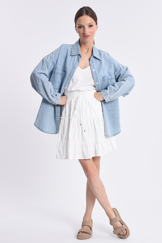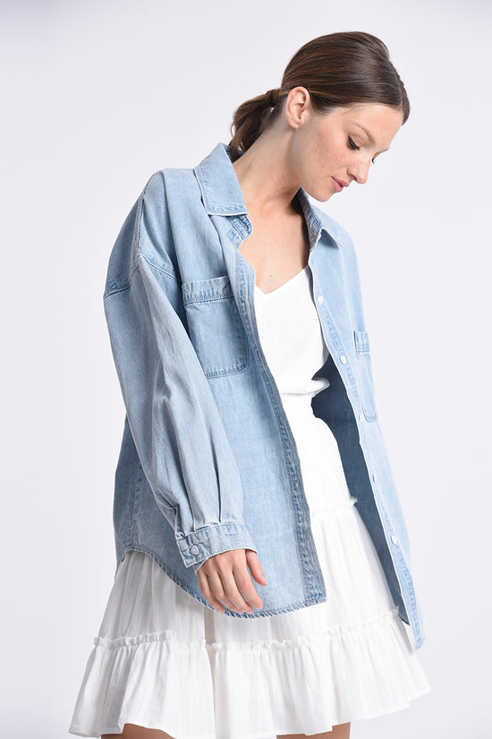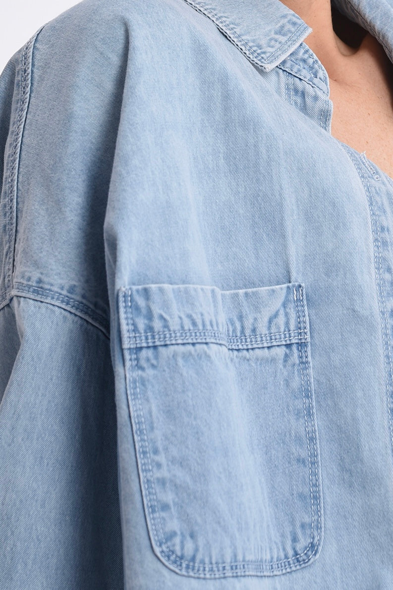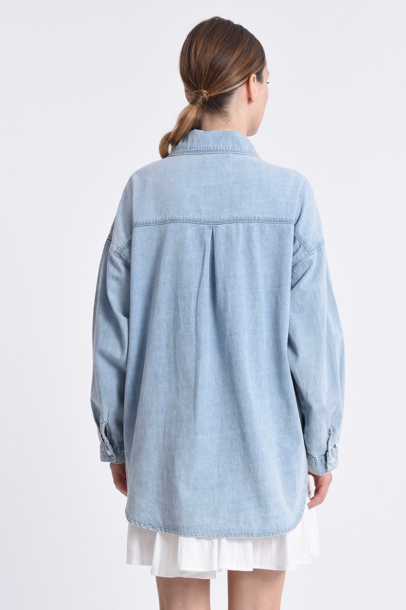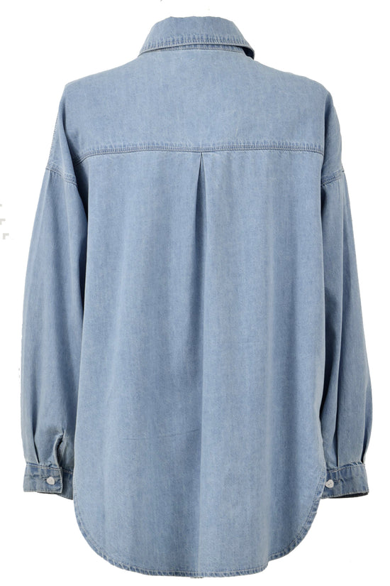 This Light Wash Denim Shirt is a great closet staple. It's the perfect piece to wear as is or layer with. Throw it over a tank or bodysuit or throw your favorite sweater on over it. The styling possibilities are endless.