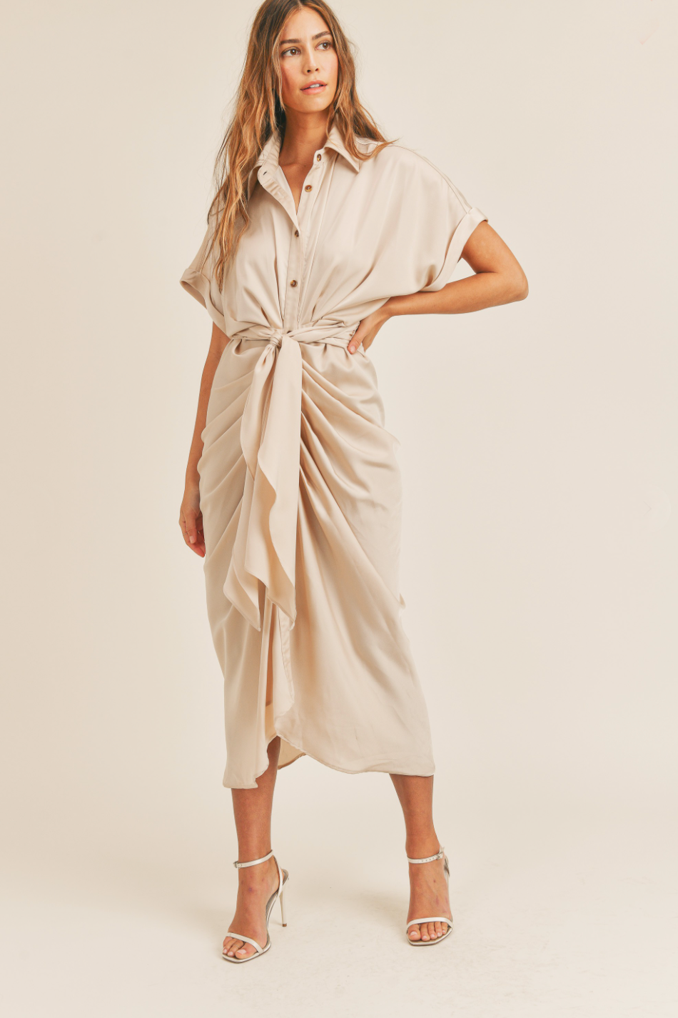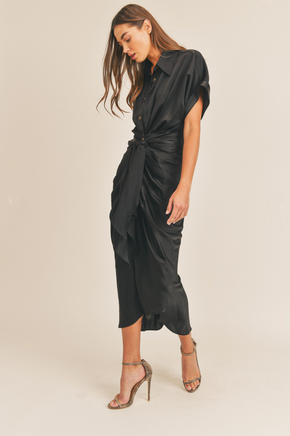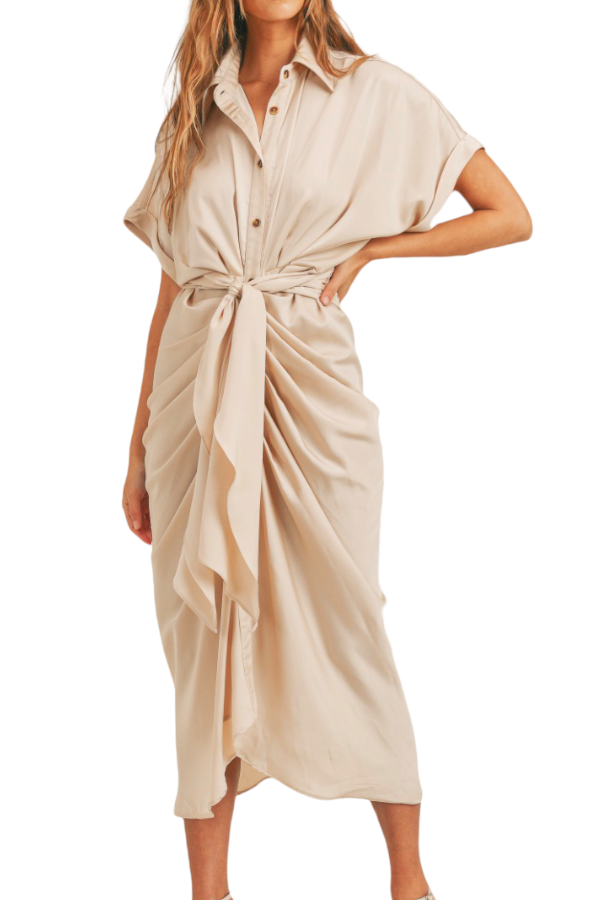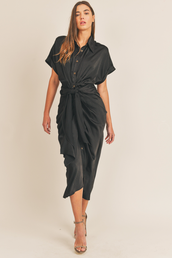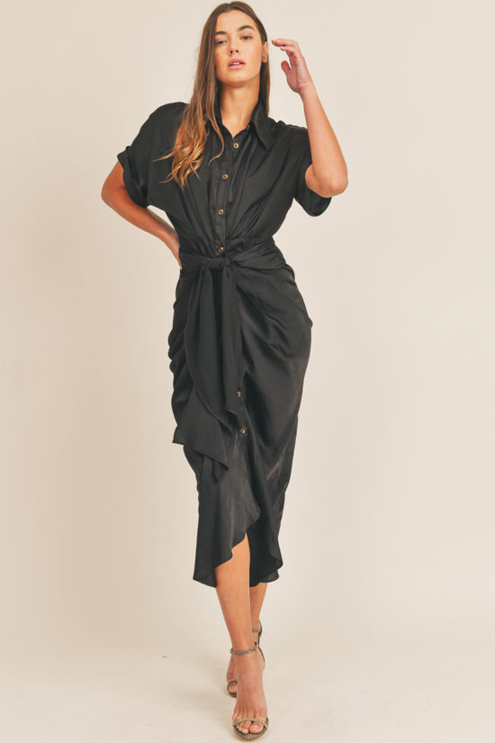 Our Farrah Satin Dress is such a head turner. It features a collared neck, full length buttons, drop shoulders and a gathered fabric front tie. Super flattering and available in 2 colors.