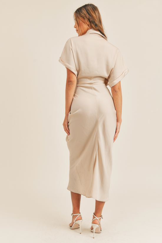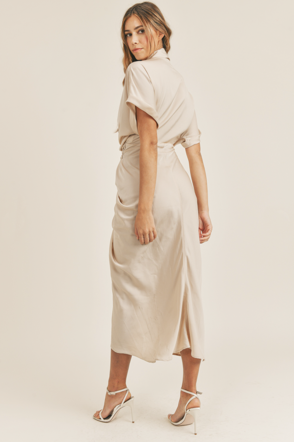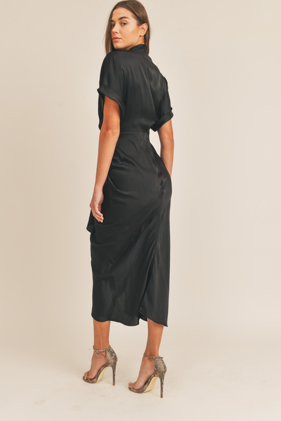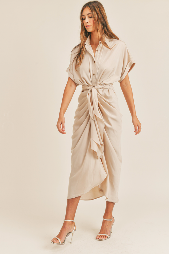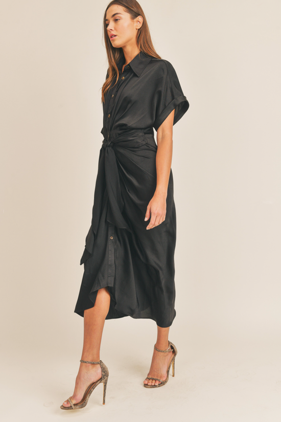 Our Farrah Satin Dress is such a head turner. It features a collared neck, full length buttons, drop shoulders and a gathered fabric front tie. Super flattering and available in 2 colors.